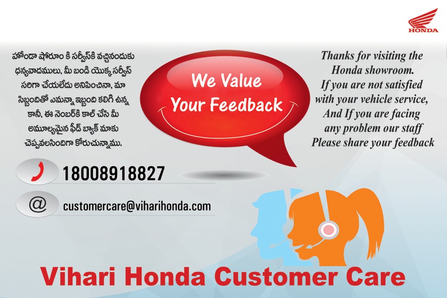 Vihari Honda have created a World-Class showroom and an excellent service center in a spacious area with modern inffrastructure and interiors.Our fully automated workshop is equppied with Ultra Modern facilities with in house denting and painting facilities.